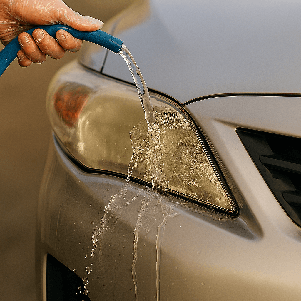 Wash the headlights with clean water to remove dust and dirt. Leave the surface wet. Put on the gloves.